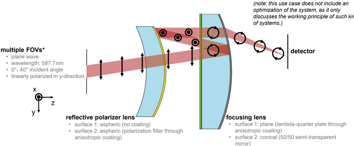 為了降低成本和重量,許多現(xiàn)代應(yīng)用引入智能方法來使其光學(xué)系統(tǒng)小型化。該原理的一種創(chuàng)新實現(xiàn)是折疊成像系統(tǒng),其中聚焦透鏡的特性分布在多個組件之間。通過巧妙地操縱傳播光束的偏振態(tài),該系統(tǒng)允許多次內(nèi)部反射,從而實現(xiàn)模擬更大透鏡的功能。本示例我們定義了一組包含不同入射角度的平面波,然后將其通過系統(tǒng)傳播計算出最終的焦點。