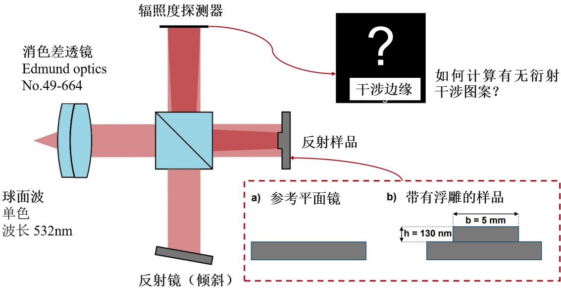 在光學系統中,由孔徑和邊緣引入的衍射效應對光的傳播有很大的影響。本示例展示了在邁克爾遜干涉儀中具有矩形高度浮雕的反射樣品系統中的衍射效應。