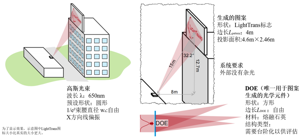 衍射光束擴散器可以設(shè)計成任何圖案。本示例中我們展示了VirtualLab Fusion設(shè)計、優(yōu)化、建模和模擬這種衍射光學(xué)元件(DOE)和整個系統(tǒng)的一些可能性,將LightTrans公司的標(biāo)志投射到建筑物的高層上。有不同的方法來生成光的圖案。本示例展示了使用相干激光和衍射光束擴散器實現(xiàn)良好的效率分布和有趣的映射圖案。