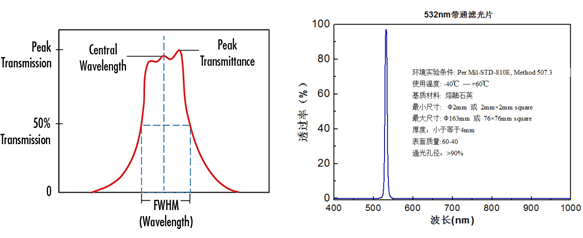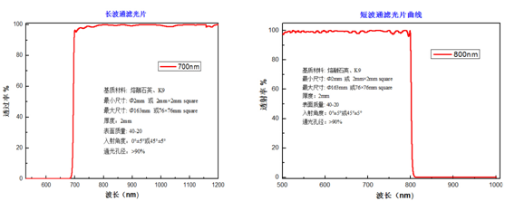 濾光片制備上我們以熔融石英、K9玻璃為基底,表面質量可做到60-40 ,在保障平均透射率大于90%的前提下,截止深度可大于OD4,其測試的典型曲線如圖2所示,其他波長、材料、尺寸及特性要求可以按照客戶需求定制。