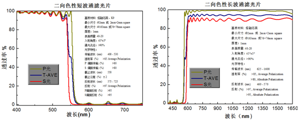 如圖5.b所示,基底材料為熔融石英,二向色性長波通濾光片的入射角為45°,截止的光線將在90°的角度被反射回去,透射率在625-1600nm范圍內平均偏振大于>85%;反射率在460-570nm平均偏振大于97%。其他波長、材料、尺寸及特性要求可以按照客戶需求定制。這一特性使濾光片非常適用于熒光應用或用作光譜分光鏡,偏振相關損耗小、光譜范圍大,且由精密熔融石英基片制作而成,且任何尺寸可根據客戶需求定制。
