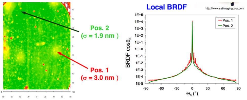 圖6. 金剛石打磨拋光鋁鏡的散射掃描及其相應位置的ARS測量,左圖: 散射掃描@532nm,散射角25°,樣本大小200*160mm 2;右圖:相應位置ARS測量。