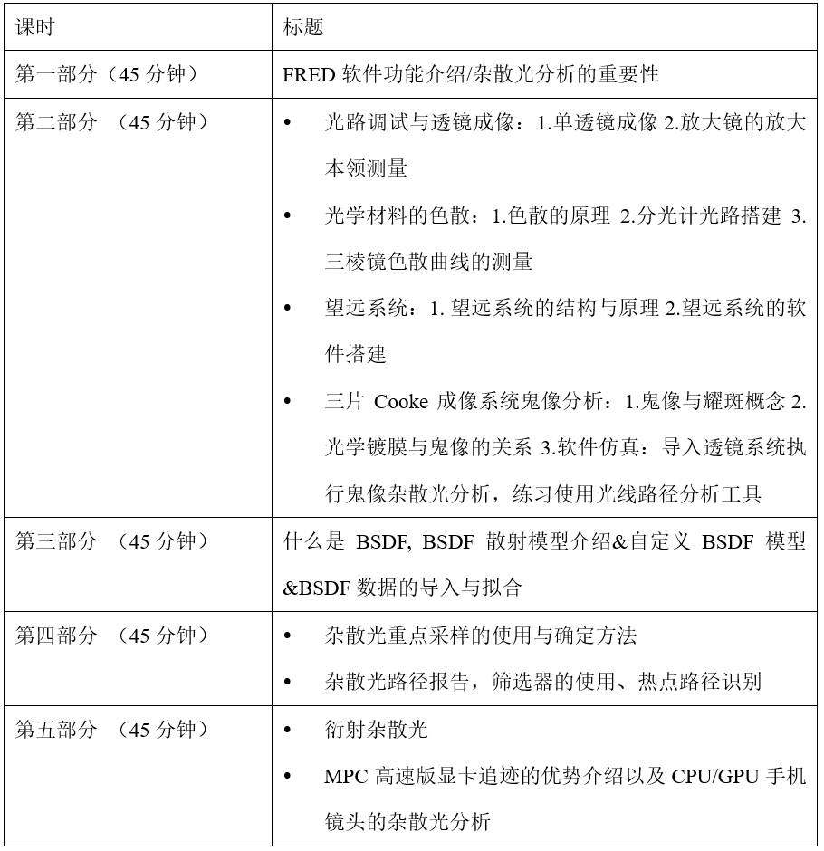 我國重大光學工程項目如拉莫斯特天文望遠鏡、高分一號光學載荷、天問火星探測、紫外光等等,如何用虛擬仿真來構建用以指導各種光學系統、儀器設計與制造,是光學的重要研究內容之一 。FRED光機系統&雜散光實驗仿真課程主要講述用FRED在成像、光機系統構建、鬼像分析、散射、薄膜為應用的不同類型的課程,提升學生對幾何光學的學習興趣,為后續的專業課程學習打下堅實的基礎。