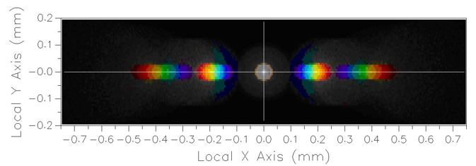 波片為通過的光的每個偏振分量提供一個差分相移。這種相移的波長依賴性意味著光束的每個顏色分量都會得到一個稍微不同的偏振調整。垂直偏振片再次濾除光的所有水平偏振分量。對于波片,偏振片以外的輻照度顯示出消光交叉圖案的減少。關于光分布的一個更有趣的觀點是它的彩色圖像,它顯示了一種彩虹色的分布。
