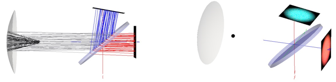 寬光譜光源對許多光學系統都很重要,應用范圍包括白光照明、分光計等。FRED中的顏色圖像分析,是通過計算每個像素的色度坐標并在表面上顯示生成的RGB值來生成顏色分布。此外,FRED還可以顯示彩色色度圖,并在用戶移動光標時指示每個像素的色度坐標。在本案例中,將觀察兩個光學系統的彩色圖像。第一個系統包括一個分色的“冷光鏡”,將白光分為兩個波長段。第二個系統利用線偏振器和波片來顯示雙折射材料的波長依賴性。