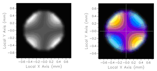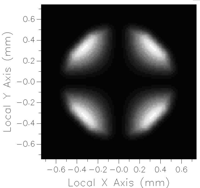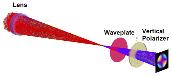 在該系統中,相干的水平偏振白光由透鏡聚焦。波片放置在焦點之外,然后是垂直線偏振片(圖6)。準直的水平偏振光不通過偏振片,然而,水平偏振光線的擴展光束在每個角落處具有一些通過的垂直偏振分量。圖7顯示了沒有波片系統的輻照度。