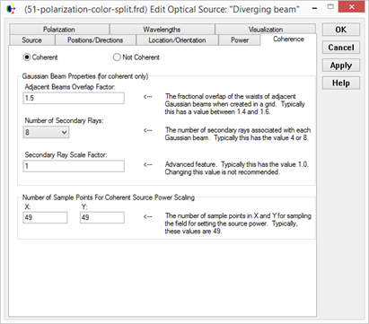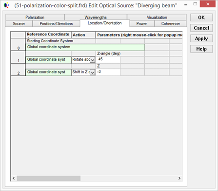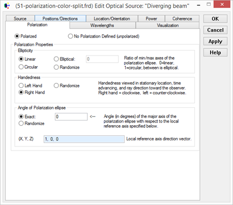 右擊光源文件夾并選擇新建詳細(xì)光源。命名為Diverging beam,光源的類型選擇為六邊形平面,方向選擇從某點(diǎn)發(fā)出,并且把這一點(diǎn)選在z軸負(fù)軸的某一點(diǎn)(0,0,-20)。設(shè)置光源設(shè)為相干光,在偏振(polarization)選項(xiàng)卡里設(shè)置光源偏振類型和方向?yàn)榫性偏振,方向?yàn)閤軸方向(下面通過(guò)把光源沿z軸選擇-45度來(lái)調(diào)整偏振方向,當(dāng)然也可以在這里設(shè)置偏振方向?yàn)槟骋粋(gè)特定點(diǎn)方向,但是用前一種方法在需要改變光源偏振方向時(shí)會(huì)更方便一些)。然后設(shè)置光源位置和旋轉(zhuǎn),將光源位置設(shè)置在(0,0,-3),沿z軸選擇-45度。