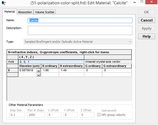 下面設(shè)置雙折射材料。在材料文件夾下右擊,選擇新建材料(create a new material),選擇類型為取樣雙折射材料或旋光性物質(zhì)(sampled birefringent and/or optically active material),波長(zhǎng)設(shè)置為0.5875618,o光和e光的折射率分別設(shè)為1.66 和 1.49,光軸方向設(shè)置為z軸(0,0,1)。