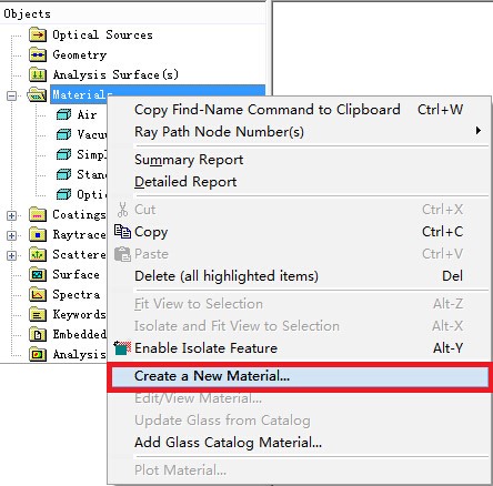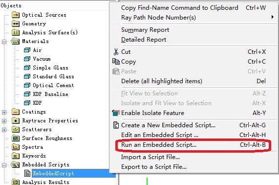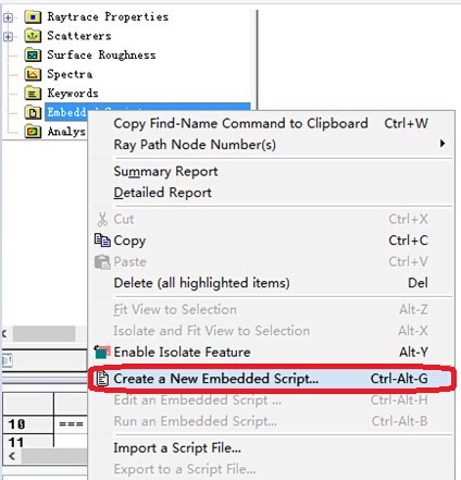 步驟3:創(chuàng)建一個(gè)折射率隨溫度變化20k后的折射率變化模型,我們利用FRED軟件自帶的VB腳本實(shí)現(xiàn)此功能。在樹形文件夾選擇Embedded Scripts,右鍵選擇Create a New Embedded Scrips,注意刪除腳本編輯器里面的所有內(nèi)容,然后粘貼如下的程序到此編輯器中。