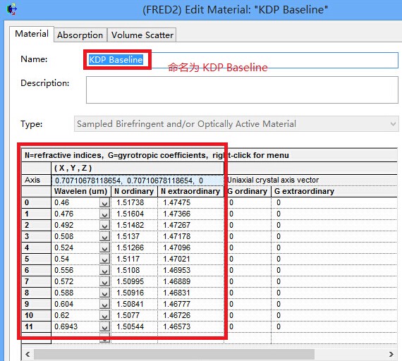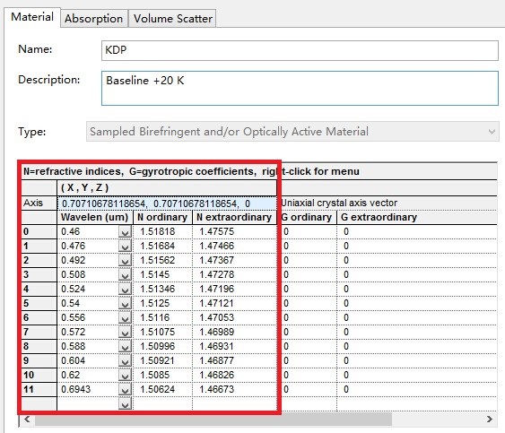 步驟1:創(chuàng)建雙折射材料KDP(磷酸二氫鉀晶體),命名為KDP Baseline。在樹形文件夾中選擇Materials>Create a New Material>Sampled Birefringent and/or Optically Active Material,按照如圖所示的數(shù)據(jù)輸入如下數(shù)值(KDP材料的創(chuàng)建方法請(qǐng)見本文后的備注)。
