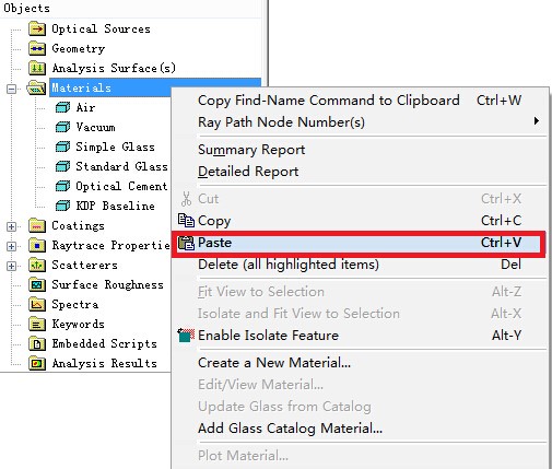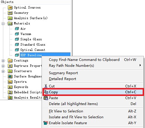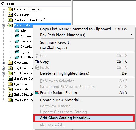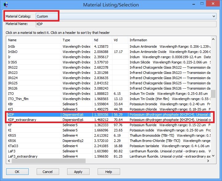 KDP材料可在材料庫中找到,在樹形文件夾Materials/ Add Glass Catalog Material… ,在類型中選擇Custom,點(diǎn)中鼠標(biāo)上下鍵移動(dòng)找到KDP(排列方式是按照第一個(gè)英文字母a-z排序)。