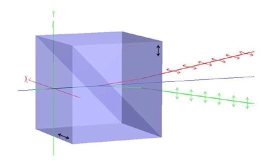 圖1. 沃拉斯頓棱鏡偏振器的晶軸標記為黑色箭頭,水平(x)偏振光向上偏折,垂直(y)偏振方向上下偏折(假定為負單軸晶體no>ne)。