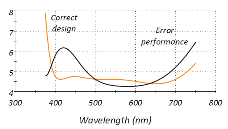 圖1.橙色曲線表示無誤差四層設(shè)計(jì)的性能,黑色曲線表示有誤差的性能。這兩條曲線都包括基板后表面的影響。
