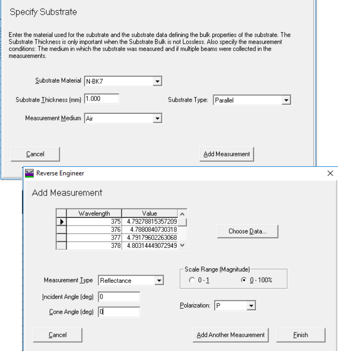 圖3.反演工程中的第二個(gè)和第三個(gè)對(duì)話框,我們?cè)谄渲休斎牖寮?xì)節(jié),然后輸入測(cè)量的性能。性能可以是反射率、透射率或橢圓參數(shù)。