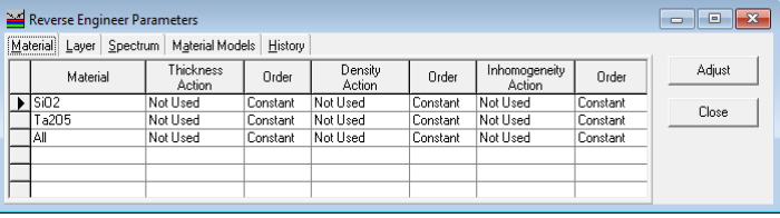 圖6.Agjust菜單是我們使用參數(shù)對(duì)話框啟動(dòng)和控制流程的地方。選項(xiàng)卡顯示我們可以改變的參數(shù)。Material選項(xiàng)卡允許所選材質(zhì)的所有層的變化。變化率可以是一個(gè)常數(shù),可以顯示,也可以在整個(gè)設(shè)計(jì)過程中線性或四次變化,這是在Order列中定義的。這基本上是工具因子的影響。