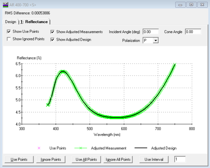 這種特殊的設(shè)計(jì)一點(diǎn)也不復(fù)雜,不太可能存在多個(gè)解決方案的問題,因此我們將選擇simplex作為優(yōu)化技術(shù)。它的選擇反映在圖4標(biāo)題欄中的符號(hào)<s>中。另一種可能性是<de>。要繼續(xù),我們打開參數(shù)對(duì)話框,圖6,可在Adjust菜單中找到。這就是我們控制進(jìn)度的地方。Material選項(xiàng)卡基本上與工具因子有關(guān),Layer選項(xiàng)卡與各個(gè)膜層有關(guān),Spectrum選項(xiàng)卡與測(cè)量中可能出現(xiàn)的錯(cuò)誤有關(guān),盡管應(yīng)將其用作最后手段,Material Mode選項(xiàng)卡與某些表達(dá)式相匹配,History選項(xiàng)卡允許導(dǎo)航回到初始結(jié)構(gòu)和在整個(gè)過程步驟中前進(jìn)。這是一個(gè)相對(duì)簡(jiǎn)單的例子,因此我們?cè)试S所有層的厚度變化,如圖7所示。優(yōu)化實(shí)現(xiàn)得很快。擬合非常接近,一個(gè)好的指標(biāo)是0.00054的RMS Difference,這是擬合接近度的一個(gè)度量。圖8的Design選項(xiàng)卡中給出了完整的設(shè)計(jì)細(xì)節(jié)以及層厚度的百分比變化,但評(píng)估結(jié)果的快速有效方法是使用Results菜單打開繪圖。在這種情況下,我們選擇隨機(jī)厚度,并得到圖9。