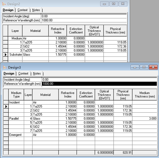 圖2.原始設計文檔(上部)通過勾選Display Setup對話框中的Medium條目添加了Medium Type和Medium Thickness列。然后將3毫米厚平行基板與背面膜層一起添加,最后將出射介質設置為空氣。
