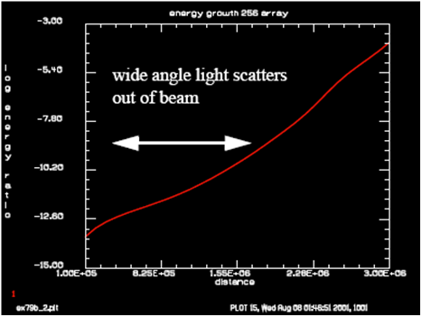 沒有受激拉曼放大下的自發輻射開始會線性增長,但是隨著傳播距離的增加,就會有越來越多的空間分量散射出主光路,最終自發輻射到達一個穩定值。越大的采樣陣列能夠涵蓋的自發輻射角度越大,但同時散射效應作用的距離也更短。