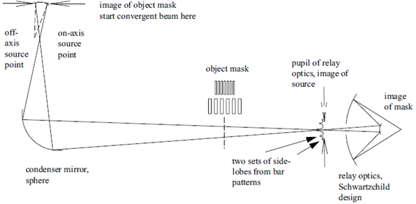本例介紹了如何上述第二種方法來實現(xiàn)部分相干光的建模。如圖1所示,整體結(jié)構(gòu)是一個科勒照明系統(tǒng)。一個聚光元件將非相干光源傳遞到轉(zhuǎn)像透鏡的入瞳處。非相干光源照亮物體掩膜面,并在最后的像面上得到適當(dāng)放大的像。為了對光束合理采樣,光源放在物體掩膜的共軛面處,以便光源具有一定的尺寸,而不是理想點光源。對于具有一定尺寸的光源,它所成的像就是部分相干的。當(dāng)光源大到可以填滿轉(zhuǎn)像透鏡入瞳時,其所成的像就將是非相干的。