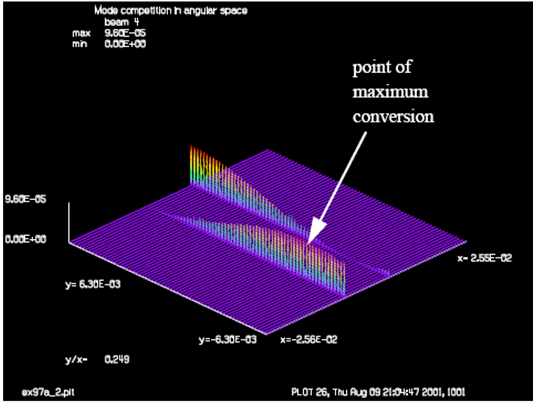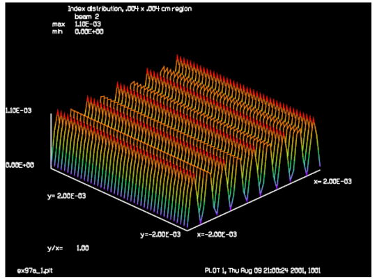 通過將干涉圖樣轉(zhuǎn)換為相位屏,GLAD能夠模擬體全息光柵。在本例中,兩束具有一定夾角的準(zhǔn)直光束形成了干涉圖樣。該干涉圖樣對應(yīng)的強度分布被轉(zhuǎn)化為相位調(diào)制分布。從而用于模擬全息記錄介質(zhì)中形成的梯度折射率分布。體全息結(jié)構(gòu)一旦形成,就可以在傳輸過程中將一束入射光波逐漸轉(zhuǎn)換成形成體全息結(jié)構(gòu)的另一束光波。兩束光波之間的能量傳遞轉(zhuǎn)換效率與體全息結(jié)構(gòu)的厚度密切相關(guān)。若厚度很薄,則入射光波轉(zhuǎn)化為另一束的效率很低,隨著厚度逐漸增加,轉(zhuǎn)換效率也隨之增加。到某一厚度時轉(zhuǎn)換效率最大,入射光束完全轉(zhuǎn)換為另一束。但是隨著厚度的進(jìn)一步增加,能量又會轉(zhuǎn)換回到入射光束。