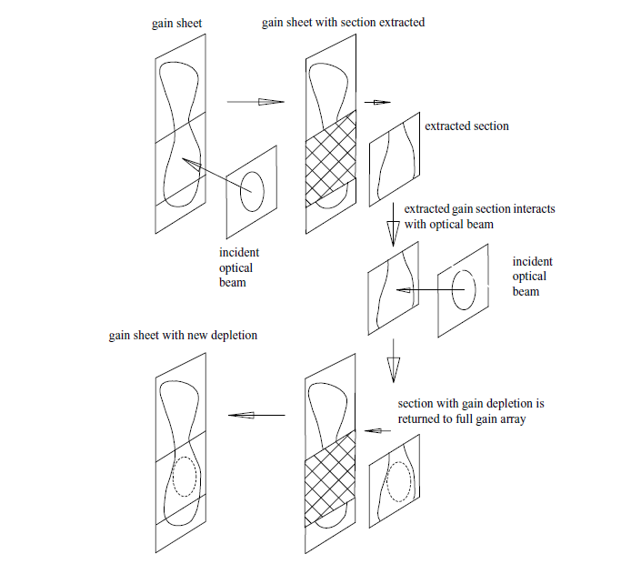 光束穿過每個(gè)增益區(qū)域5次,每次都在不同的位置,我們可以用一個(gè)矩形陣列來代替增益介質(zhì),這個(gè)陣列比光束陣列要大很多,如圖2所示。光束入射到增益區(qū)域就相當(dāng)于入射到圖2的左上區(qū)域。增益陣列與光束相匹配的區(qū)域被抽出,抽出的區(qū)域與光束進(jìn)行相互作用,然后再插入到整個(gè)增益陣列中。
