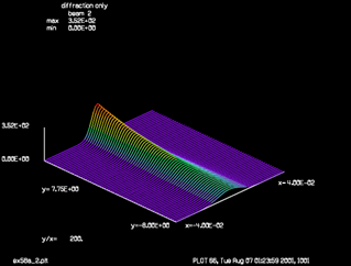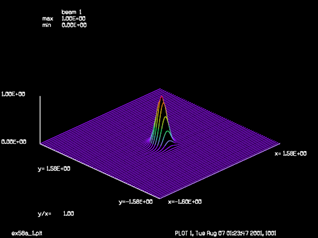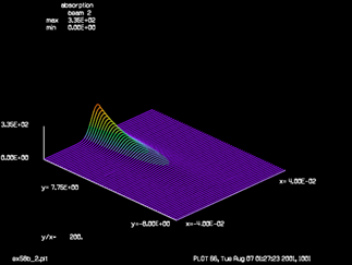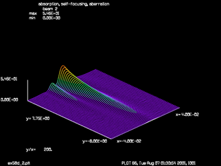 本例重點展示了beer以及sfocus兩個命令的使用,給出了經過吸收之后高斯光束的強度分布輪廓圖,光束的吸收遵循比爾定律并且可能會出現自聚焦現象。研究發現,自聚焦效應會導致穿透剖面變窄,本例對比了以下四種情況:
