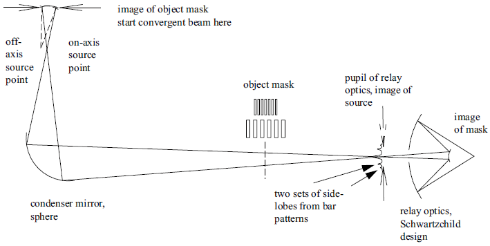 本例介紹了如何上述第二種方法來實現部分相干光的建模。如圖1所示,整體結構是一個科勒照明系統。一個聚光元件將非相干光源傳遞到轉像透鏡的入瞳處。非相干光源照亮物體掩膜面,并在最后的像面上得到適當放大的像。為了對光束合理采樣,光源放在物體掩膜的共軛面處,以便光源具有一定的尺寸,而不是理想點光源。對于具有一定尺寸的光源,它所成的像就是部分相干的。當光源大到可以填滿轉像透鏡入瞳時,其所成的像就將是非相干的。