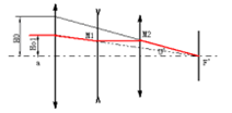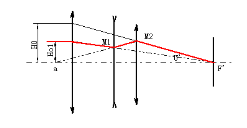 另一方法保持兩組之間光線平行光軸,有了前組距離求得光線投射高度M1,M2=M1,這兩組的焦距也不難求解,計算方法簡單。