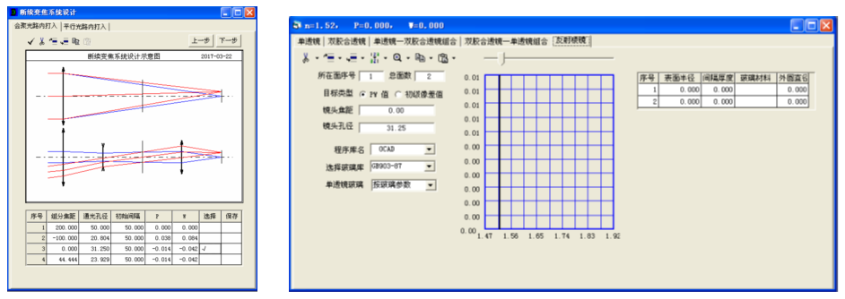 繼續點擊“下一步”,就可以進入系統初始結構自動設計階段。此時可以利用設計窗口內下部表格內的“選擇”欄內選擇設計哪一組鏡頭。選擇后界面自動出現“透鏡單元結構設計”窗口進行設計。設計完畢在表格內點擊“保存”,將會自動完成該組設計。