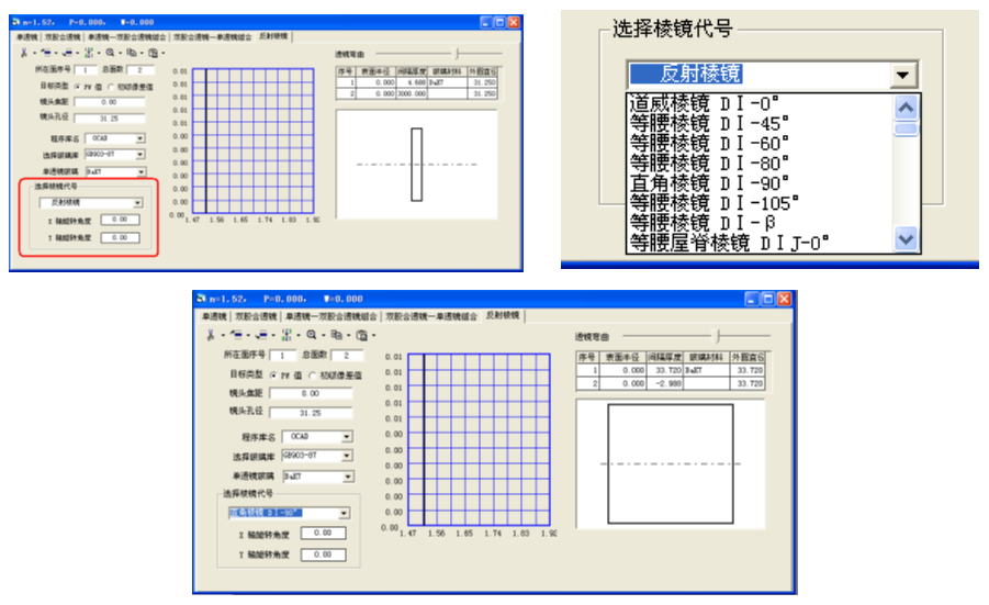 在此界面內需要先選擇棱鏡玻璃材料,接著界面變化可以進一步選擇反射棱鏡名稱代號。然后再在系統數據表內選擇反射棱鏡棱鏡名稱代號。選擇完成有程序自動計算零件光軸展開長度(中心厚度),至此反射棱鏡選擇完成。