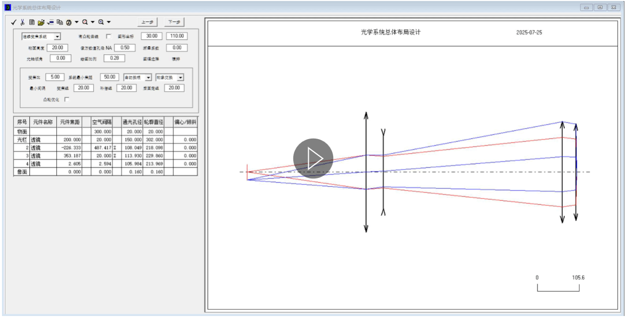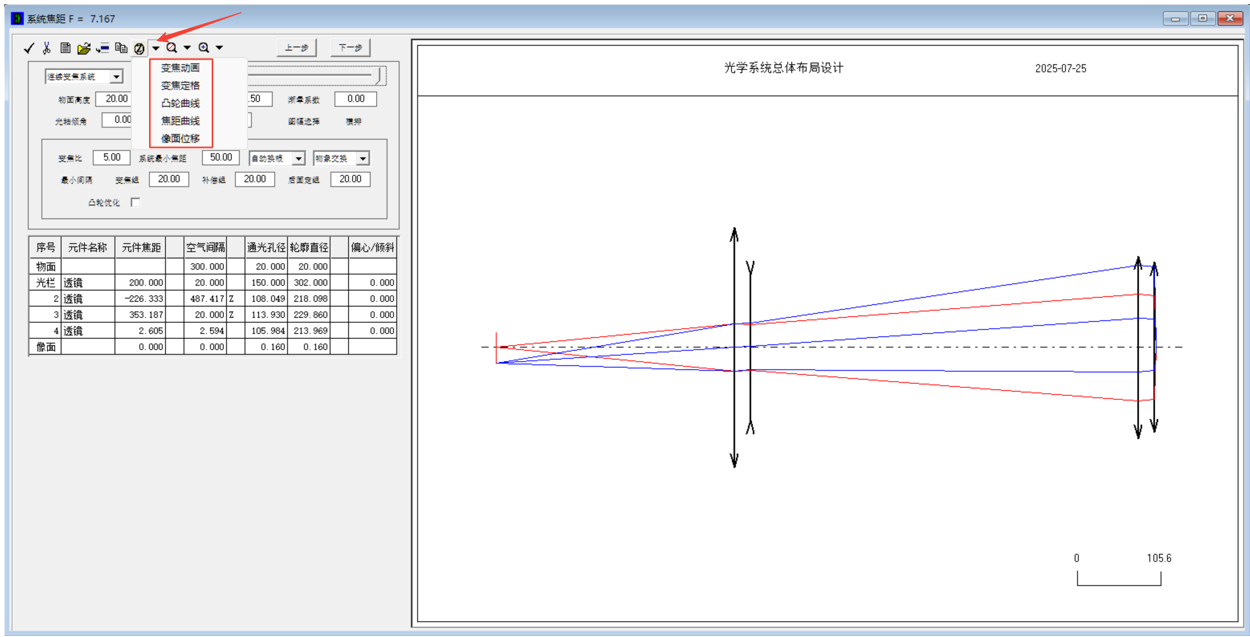 然后發現界面上顯示的不是系統焦距值,而是初始放大率值以及變倍比、物面高度、像面高度、物方數值孔徑NA0、像方數值孔徑NA0以及系統最小焦距等內容。