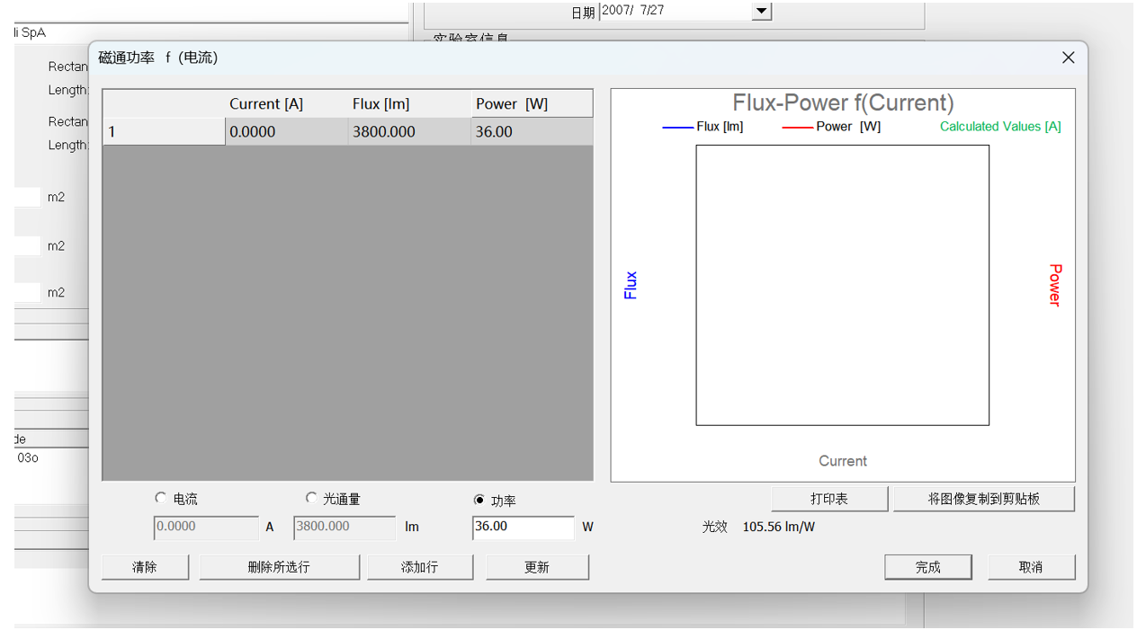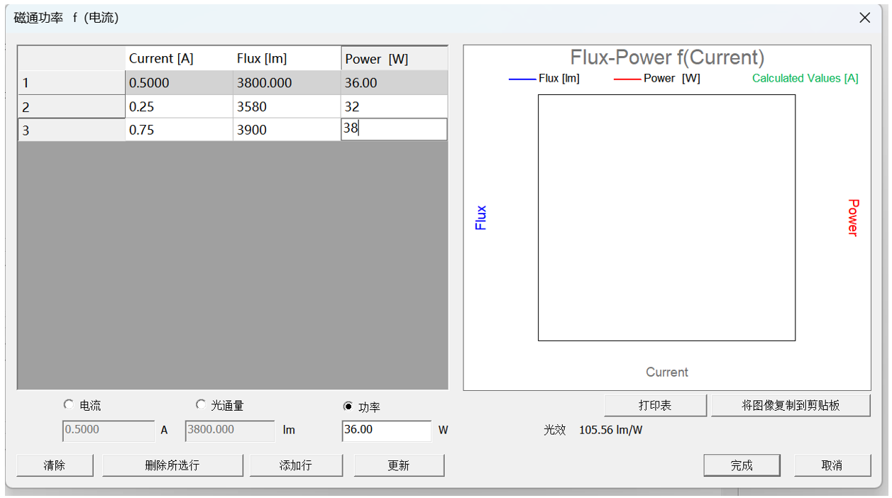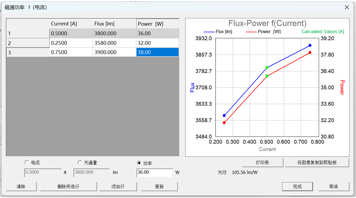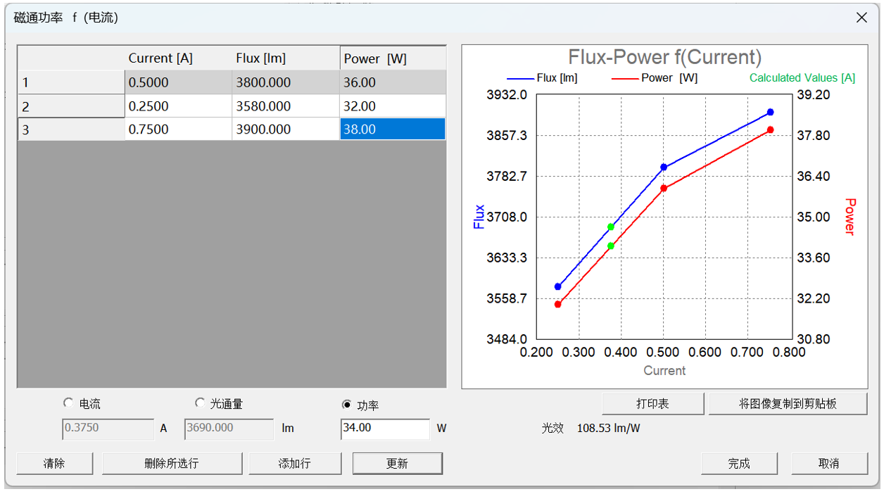 將功率改為34W后,點擊更新,可以查看在此條件下的光通量和電流,點擊完成,保存為OXL文件(保存其它文件格式時,只能保留一組數據),保存后,再次導入時可以看到完整的數據
