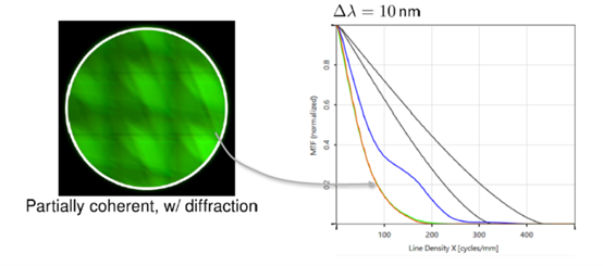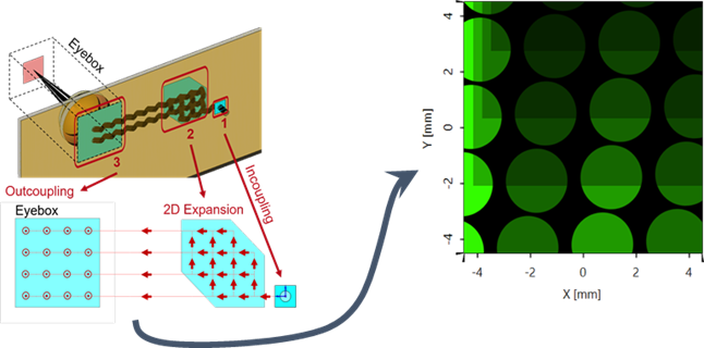 在波導(dǎo)AR模型的眼箱中模擬光瞳中的光分布以及由此產(chǎn)生的MTF。仿真結(jié)果包括光源的時(shí)間相干性分析和波導(dǎo)內(nèi)部的衍射分析