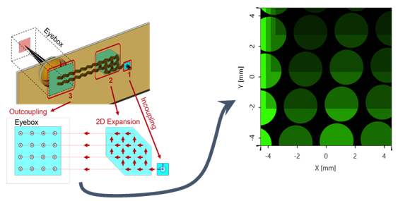 通過高速物理光學,可以對1D和2D微納光柵進行嚴格的電磁分析,獲得相應的近場、衍射級次以及衍射效應,同時能夠對光柵進行優化,以獲得所需要光柵結構參數并集成到整個光學系統中進行分析。