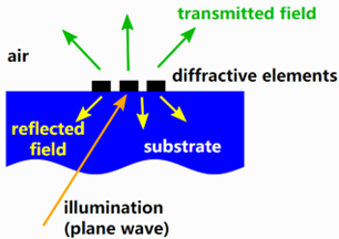 通常,DOE駐留在介質襯底上。照明光場(如平面波)從下方或上方照射到DOE。這激發了透射場和反射場,這是我們感興趣的典型參量。