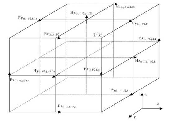 FDTD依賴于求解域的空間和時間的離散化。耦合的電磁場沿著由Yee單元組成的網格進行離散化。磁場和電場分量以交錯的方式定位在每個單元的邊緣上。 通過計算立方體的相對邊緣上的兩個場分量之間的有限差分,可以獲得場的空間導數的二階近似。有限差分法同樣用于近似場的時間導數。用于計算和更新每個時間步的電場和磁場的模擬空間的算法稱為Yee算法。當空間和時間步長趨于零時,計算問題的解的精度應收斂。這種增加的準確性是以完成模擬所需的時間和存儲模擬所需的內存為代價的。