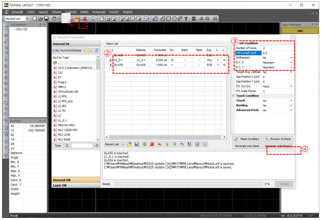 b) ① SIM (生成) → ②堆棧層并設置厚度→ ③設置網格條件→ ➃ 生成網格