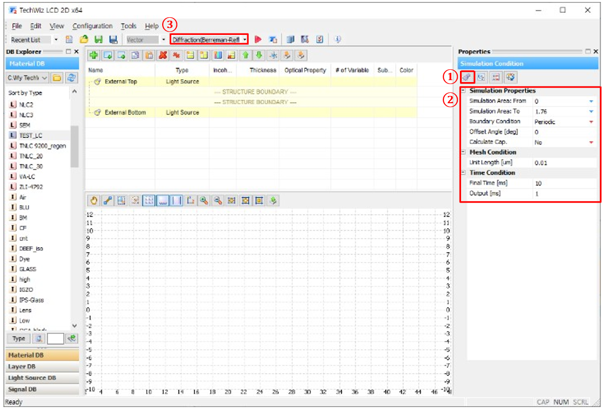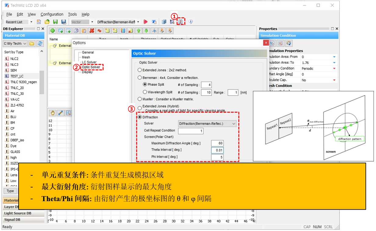 a) ① 仿真條件→ ② 設置仿真屬性 → ③ 選擇光學求解器 (Diffraction(Berreman Reflec.))