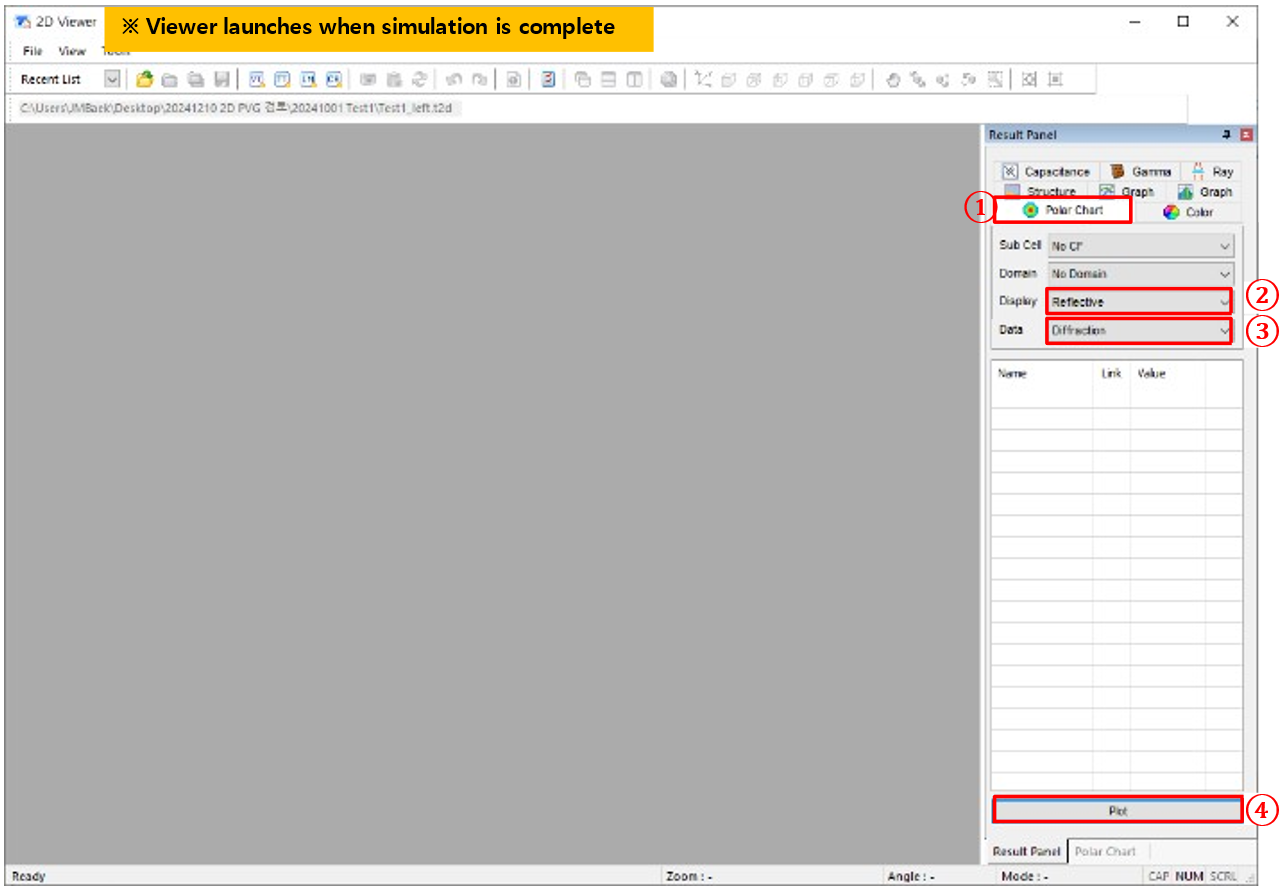 g) ①極坐標圖→ ②選擇顯示(反射)→ ③ 選擇數據(衍射)→④ 繪制