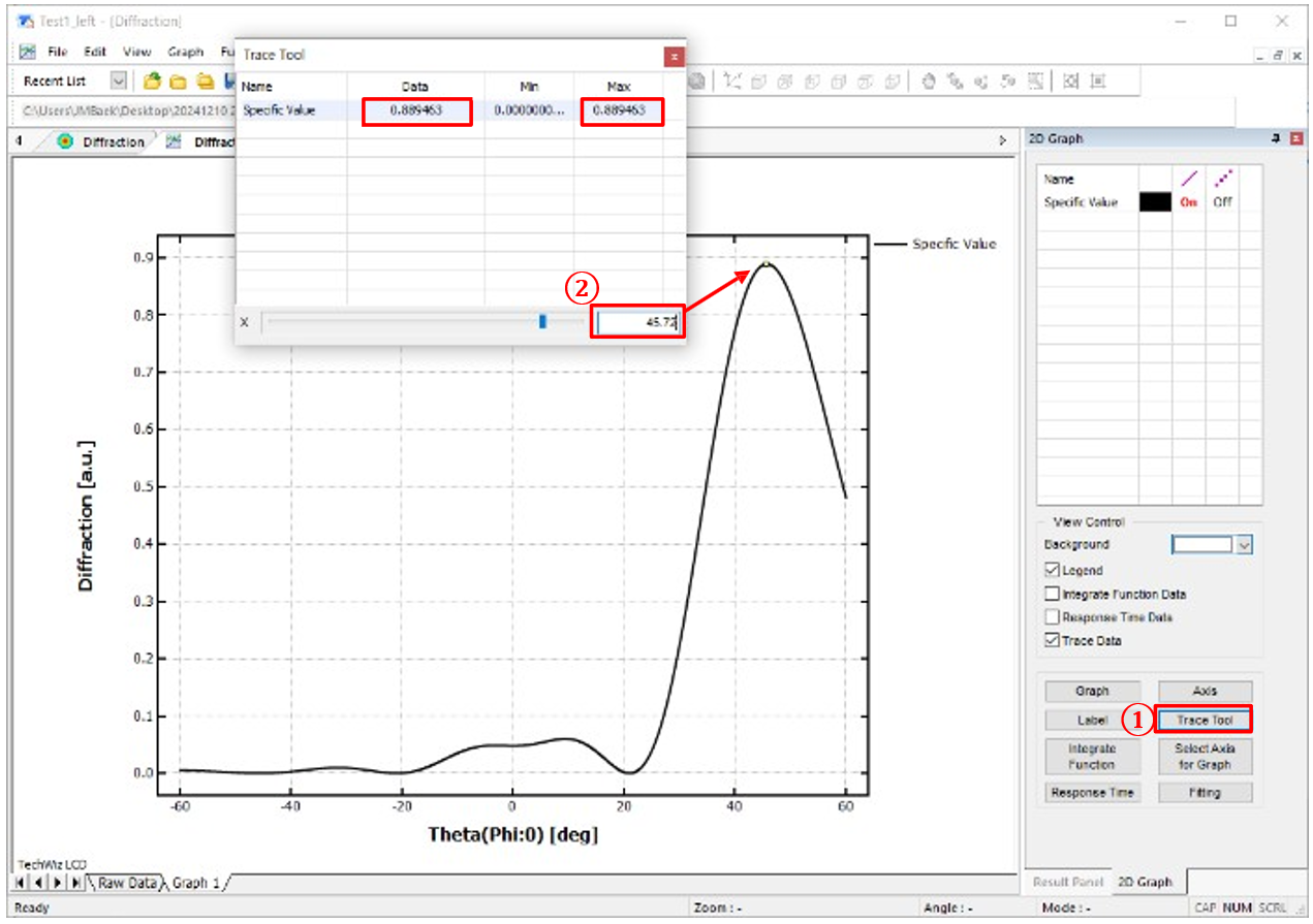 i) ①選擇跟蹤工具→ ②設置Theta值(衍射角:45.72˚(數據最大值點))