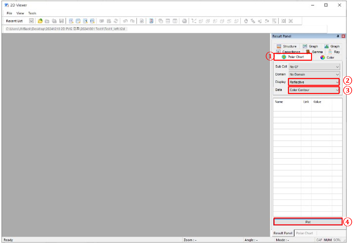 j) ①極坐標圖→ ②選擇顯示(反射)→ ③ 選擇數據(色彩輪廓)→④ 繪制