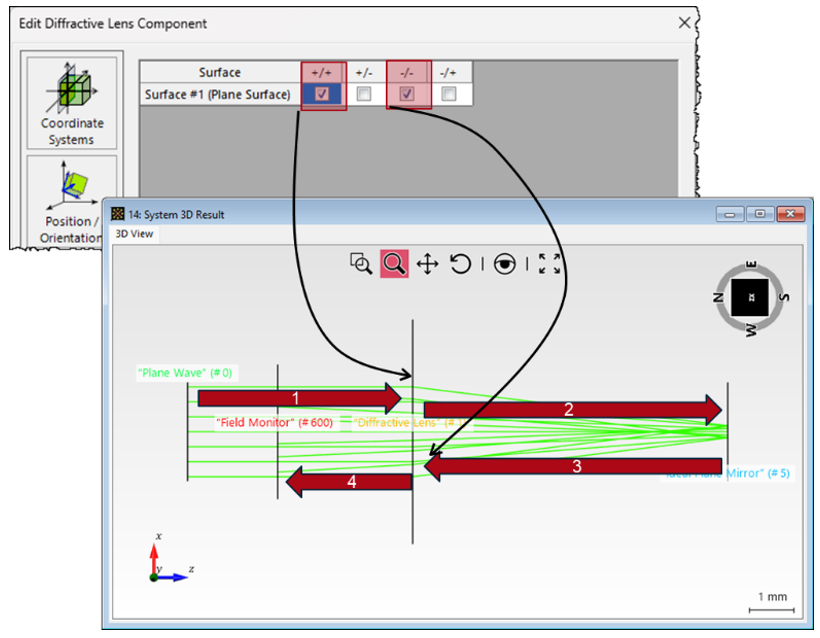 • 衍射透鏡元件現在支持全部四種表面通道(++, +-, -+, --)。