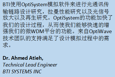 “由于光系統變得越來越復雜,科研人員和工程師必須采用先進的軟件模擬技術以在設計中獲取至關重要的幫助。OptiSystem的強大的功能和靈活性促進了有效且高效的光電設計。”