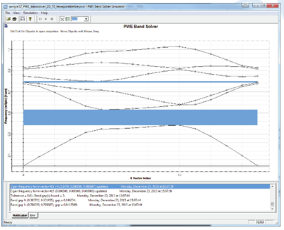 2D PWE能帶求解器和光子晶體編輯器的完全集成能夠幫助用戶設計和模擬任意類型的光子晶體問題(1D,2D,3D)。PWE能帶求解器通過掃描簡約布里淵區的波矢量空間可以找到結構的本征頻率。最終在生成的能帶圖中自動地畫出帶隙。