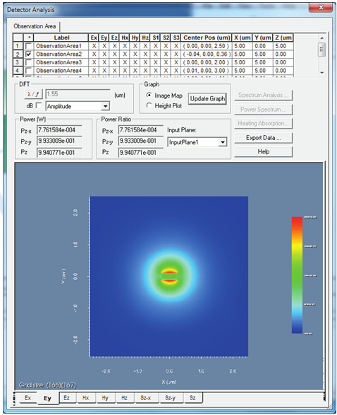 OptiFDTD提供了大量的模擬分析工具。使用OptiFDTD分析器,用戶可以通過探測器觀察任意場方向的時域和頻域(使用FFT或者DFT)的振幅,相位,實部或者虛部值。所有的數據都能夠導出以用于第三方軟件工具,如MatlabTM或者OriginTM以用于進一步的處理或者應用。