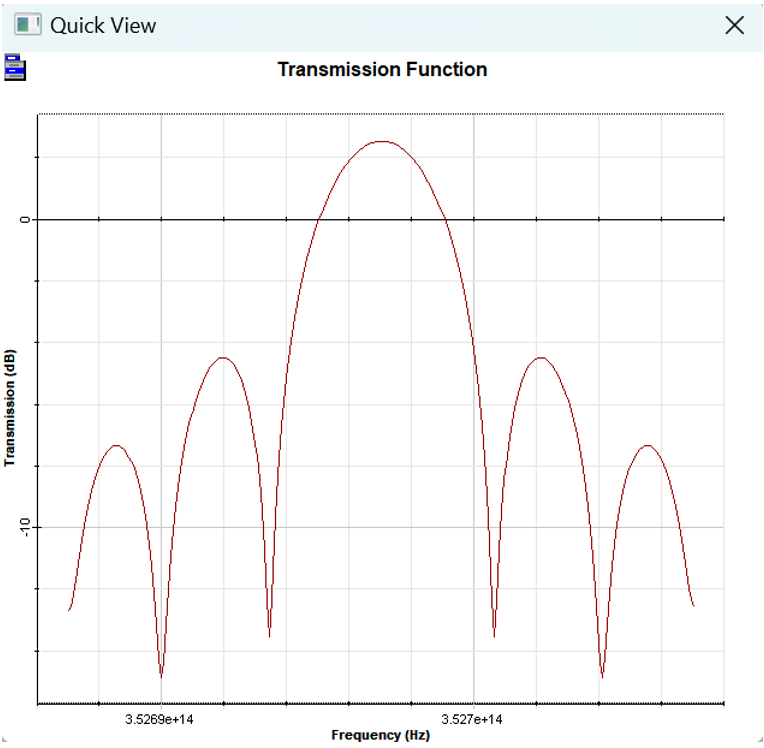 對于濾波分析儀,將參數“Frequency”設置為850nm,“Frequency range”設置為20ghz,“Time domain”設置為true,“Frequency unit”設置為Hz。