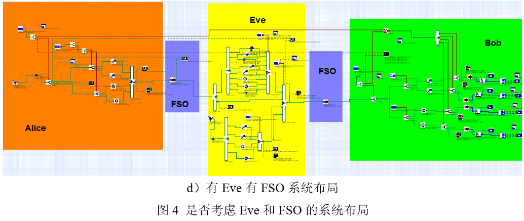 下面,我們考慮量子比特經自由空間光(FSO)傳輸后對眼圖的影響。圖4(a、b、c、d)依次為無Eve無FSO、有Eve無FSO、無Eve有FSO以及有Eve有FSO的BB84系統布局。