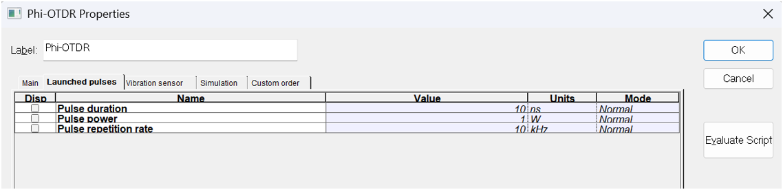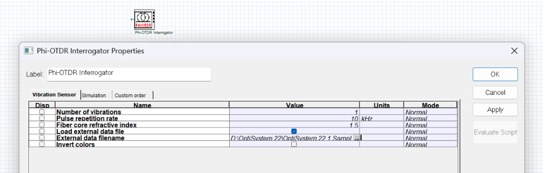 利用Φ-OTDR組件模擬基于瑞利散射的光纖振動傳感器的行為。該組件可用于感應不同位置的多種振動。用戶輸入振動次數及其位置、光纖長度和光纖參數、激光特性和發射脈沖條件。然后,基于瑞利散射效應的Φ-OTDR分量計算振動頻率和位置。如圖2-圖4所示,依次設置傳輸光纖、發射脈沖以及振動分布。