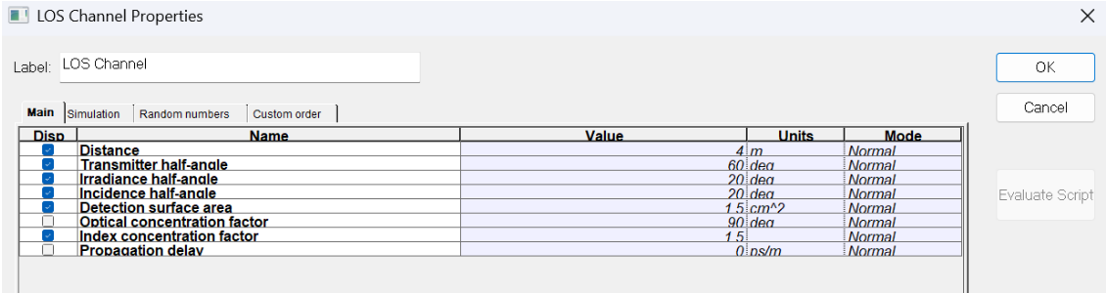 對于LOS傳輸系統,我們使用LOS信道組件,它基于朗伯源模型對視距內的光無線信號傳輸到接收機進行建模。設置發射機和接收機距離,發射角度和接收角度等參數,如圖3所示。