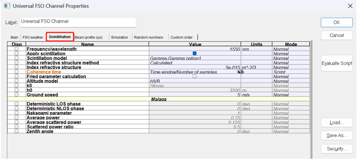 FSO信道采用Universal FSO Channel組件,它允許定義弱、中等和強湍流的各種閃爍模型。在組件的Scintillation選項卡下,按圖2所示設置。